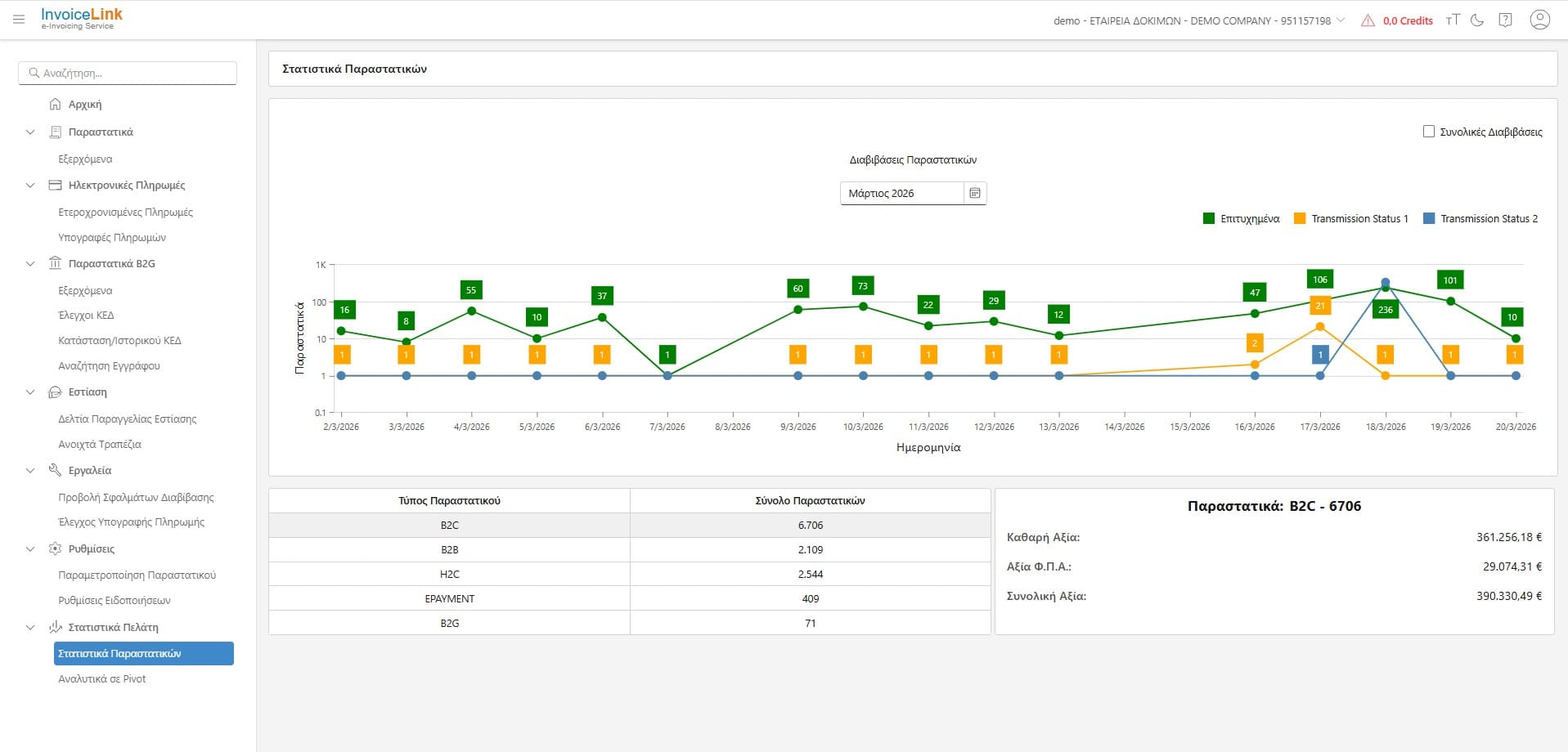 Υποστήριξη πλήρους ηλεκτρονικής τιμολόγησης για υπηρεσίες μεταφοράς & logistics, προσαρμοσμένη στον φόρτο παραστατικών που προκύπτει από τη διακίνηση αγαθών.