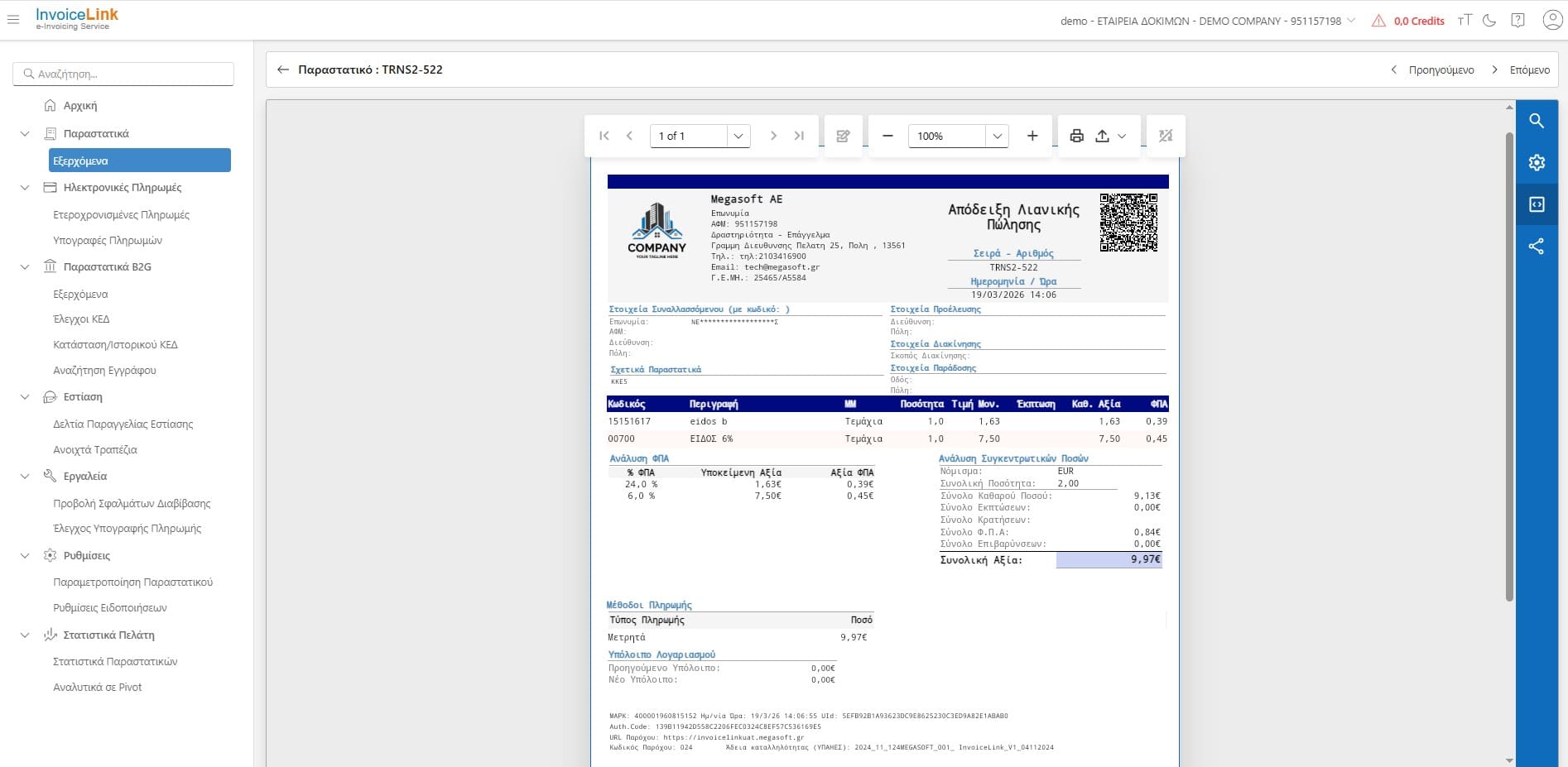 Αποστολή και αρχειοθέτηση στο Cloud, με πλήρη ασφάλεια και δυνατότητα QR επαλήθευσης.